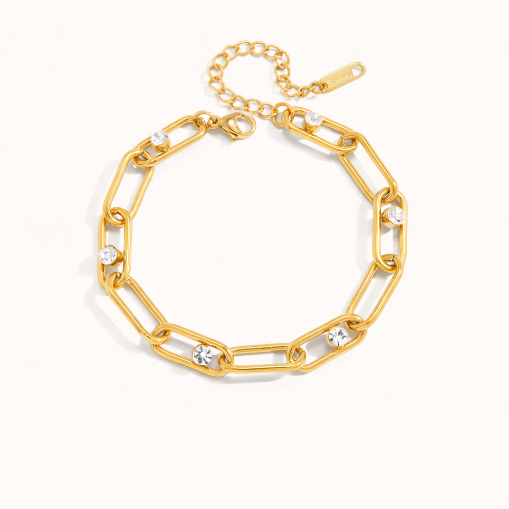 This gold link bracelet combines a bold chain design with subtle sparkle for a refined, modern look. Featuring elongated rectangular links accented with clear stones, it strikes the perfect balance between statement and sophistication.