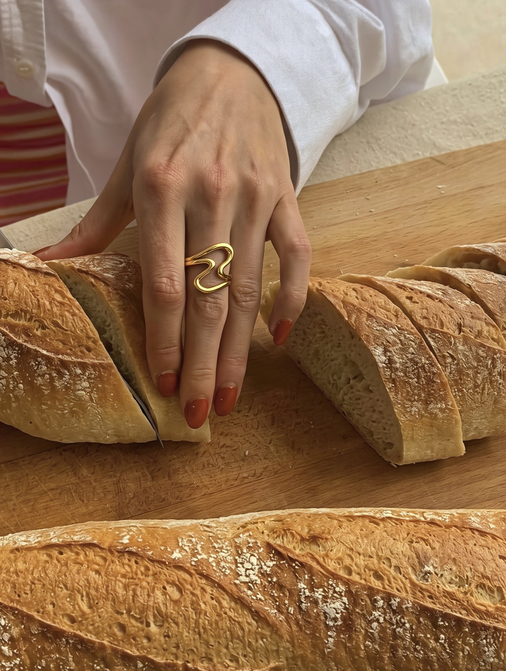 This sculptural gold wave ring is a bold yet elegant statement piece. Designed with fluid, organic curves, it wraps around the finger in a dynamic, modern silhouette. The smooth, high-polish finish reflects the light beautifully, giving the ring a luxurious and contemporary feel.