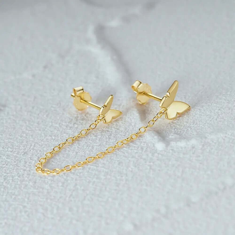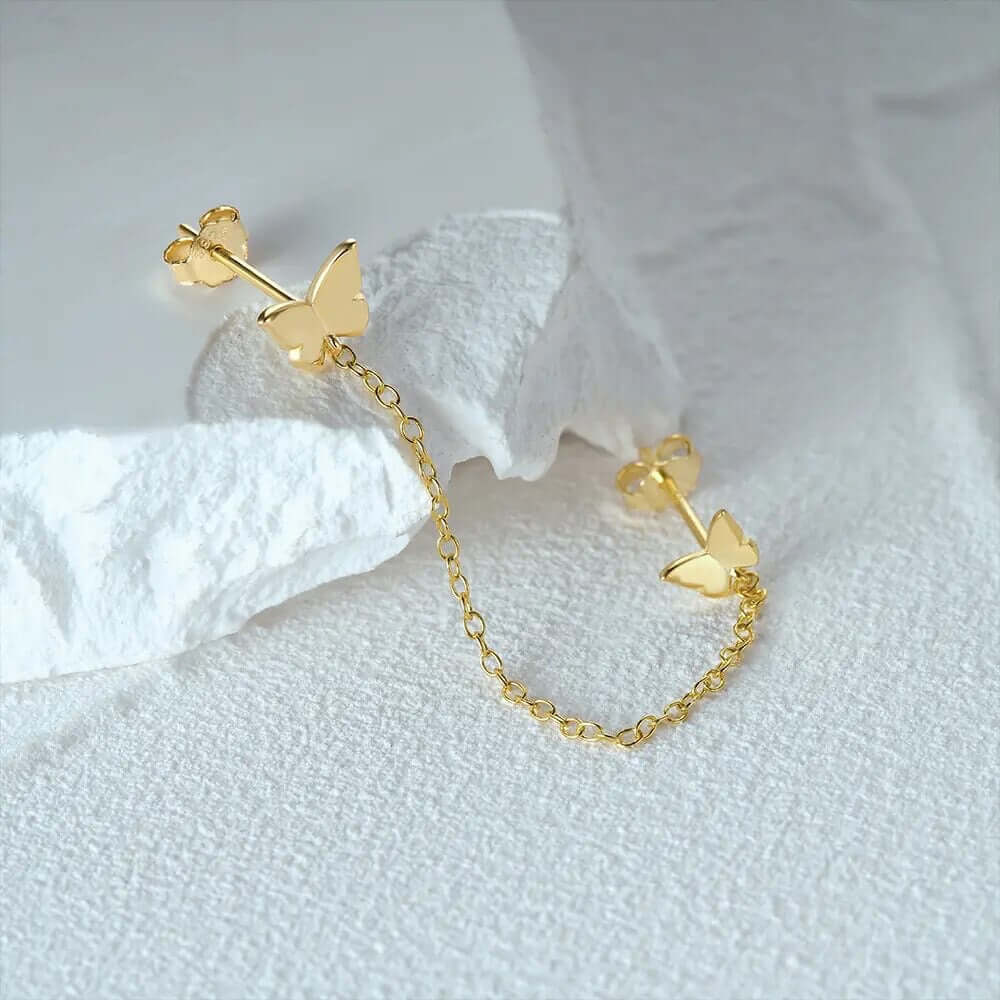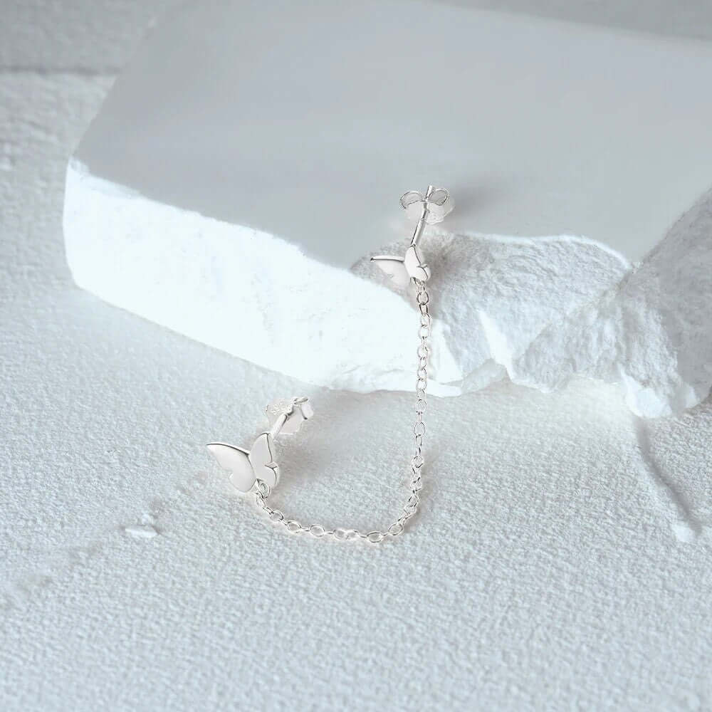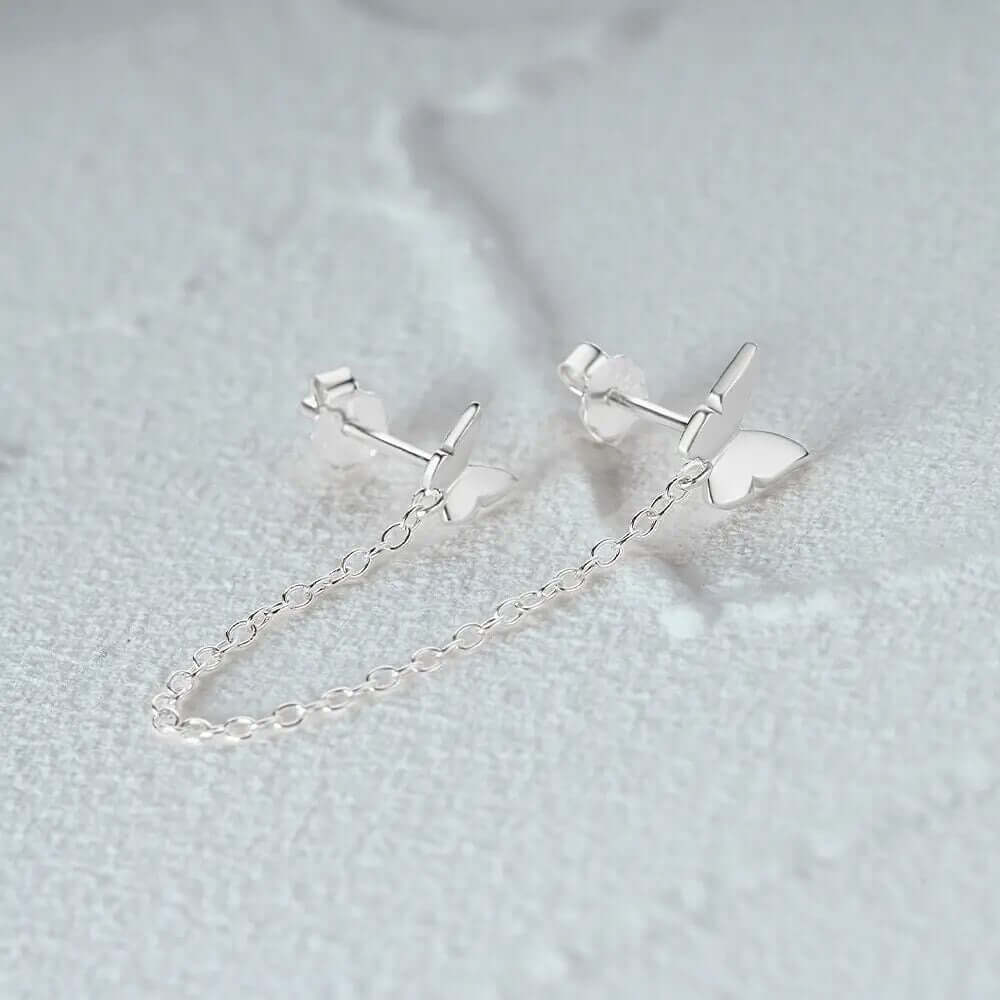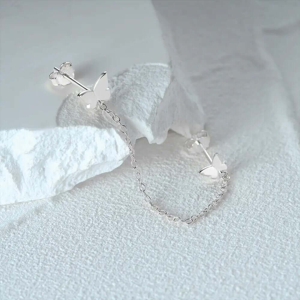 Look fly with these flirtatious earrings! Crafted from sterling silver, these stud earrings feature two elegant little butterflies delicately connected by a fine chain. Get ready to unleash some magic!