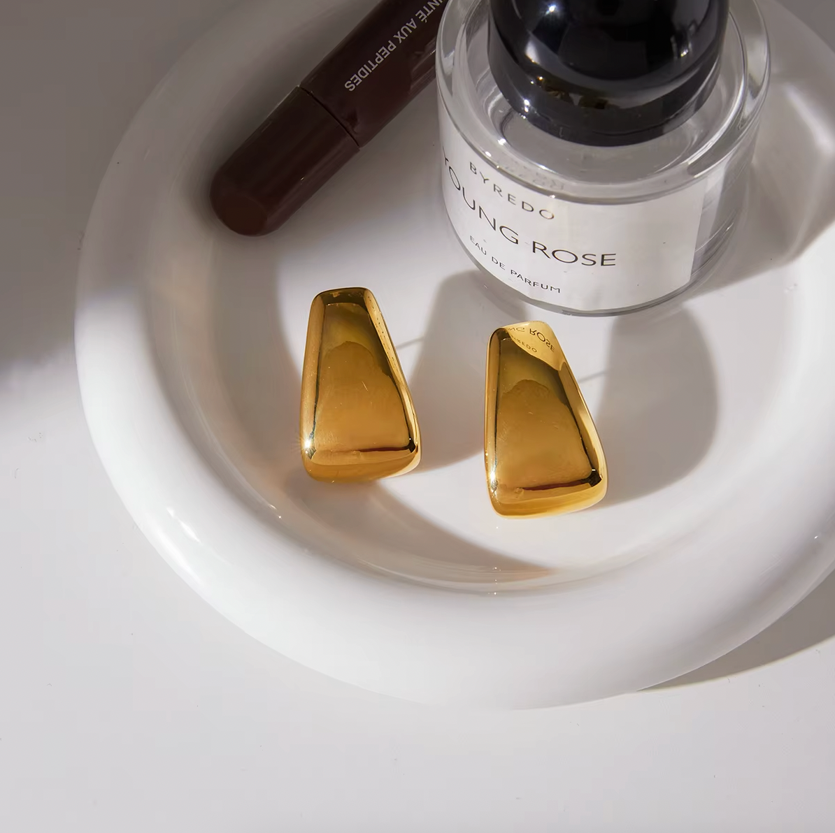 These gold-tone statement earrings feature a bold, sculptural design with smooth, tapered lines and a high-shine finish. Their minimalist yet striking silhouette makes them the perfect accessory for elevating both everyday outfits and evening looks.