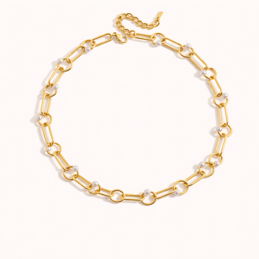 This gold chain necklace combines bold links with delicate pearl accents for a modern yet feminine look. The polished oval links create a strong, contemporary silhouette, while the subtle white pearls add a soft, elegant contrast. Designed to sit beautifully on the neckline, it’s a statement piece that still feels effortlessly wearable.
