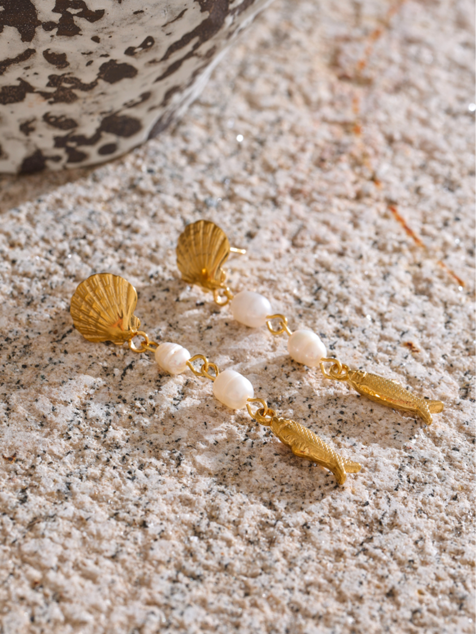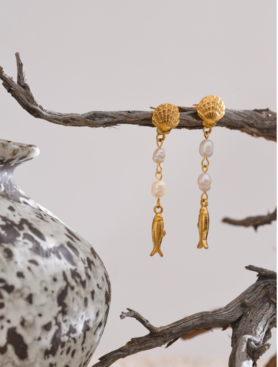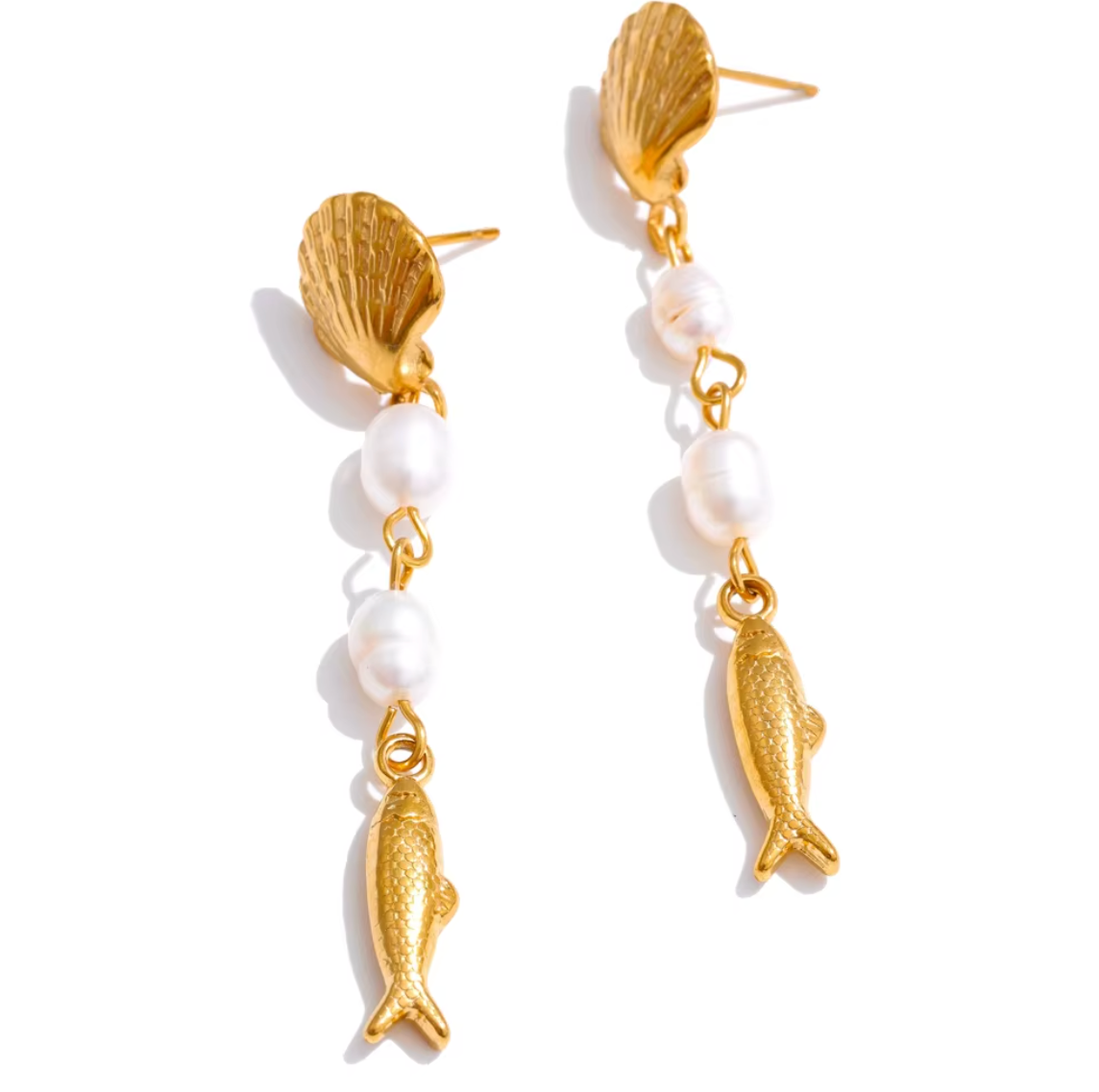 Voeg een vleugje speelsheid toe aan je look met de Lior oorbellen. Deze lange oorbellen, gemaakt van duurzaam roestvrij staal, zijn versierd met elegante witte parels en charmante visvormige hangers. Perfect voor wie houdt van een speelse touch in zijn sieraden. Ze geven elke outfit een frisse, door de oceaan geïnspireerde sfeer.