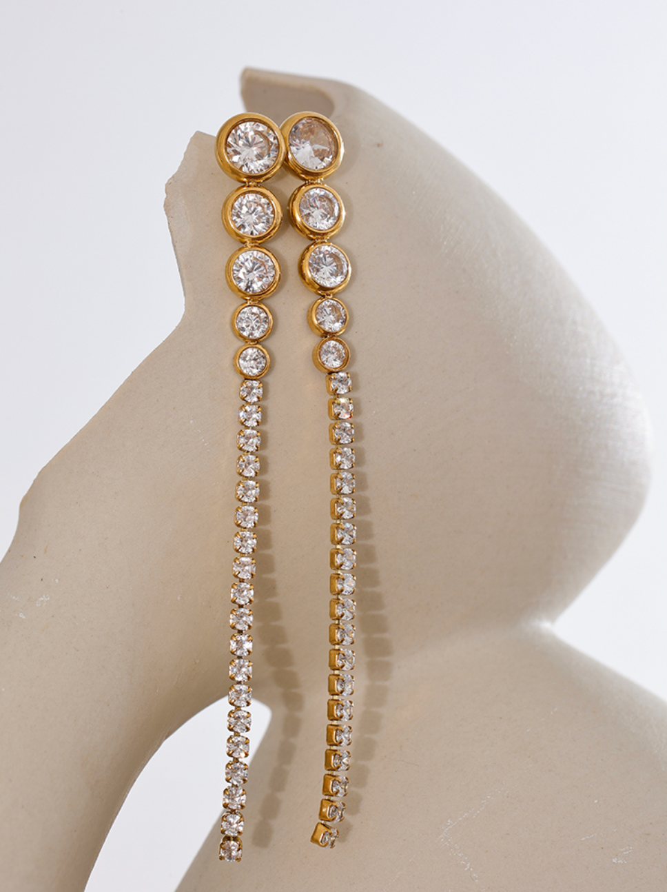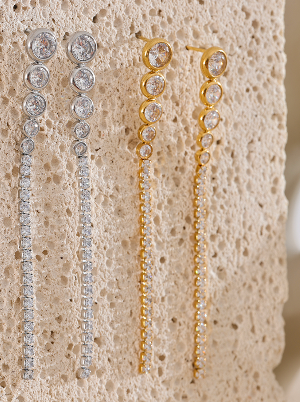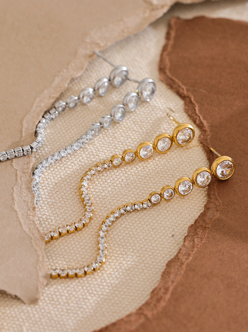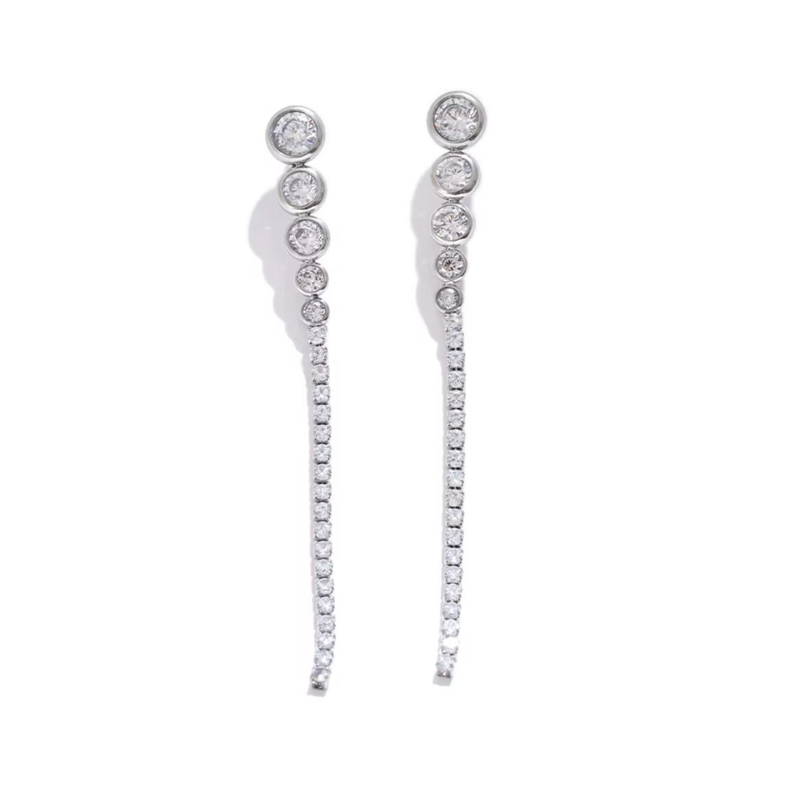 Geef je feestelijke look een sprankelende twist met de Odette oorbellen. Deze opvallende oorbellen, gemaakt van strak roestvrij staal en bezaaid met witte zirkonia's, geven speelse elegantie aan elke outfit. Perfect om alle aandacht te trekken en de dansvloer te laten schitteren!