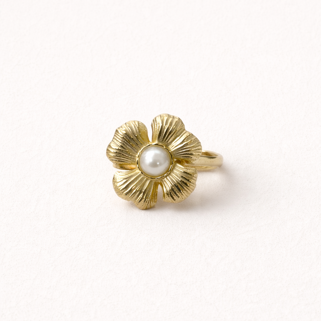 Add a touch of whimsy to your wardrobe with our Summertime Harmony RING. Crafted from durable stainless steel, this flower-shaped ring features a precious pearl in the center. Perfect for adding a playful pop to any outfit.