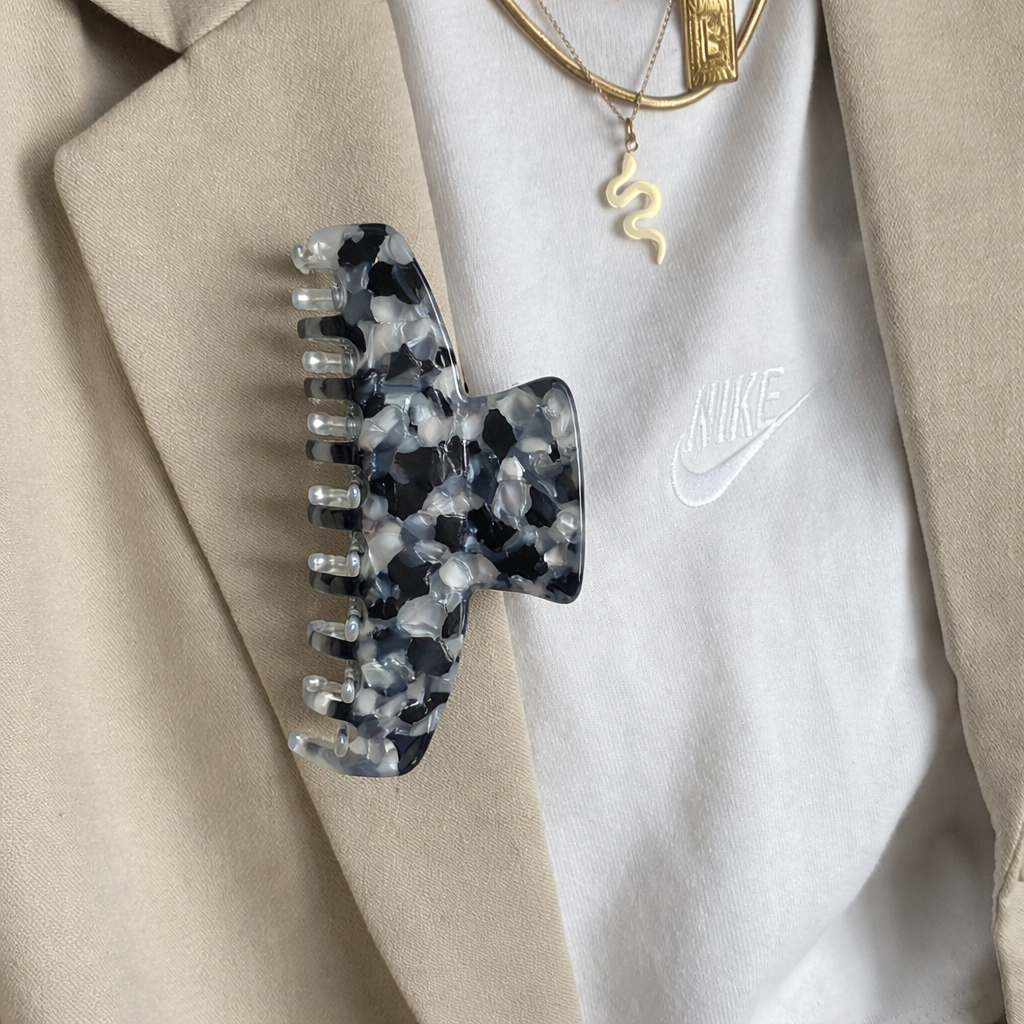 Breng je lokken in model met de French Girl HAARCLIP, de uitgesproken stijlvolle keuze voor een moeiteloze alledaagse look. Deze grote haarclip, verkrijgbaar in twee chique kleuren en gemaakt van acetaat, geeft je een stijlvolle 'je ne sais quoi' die zeker de aandacht zal trekken!