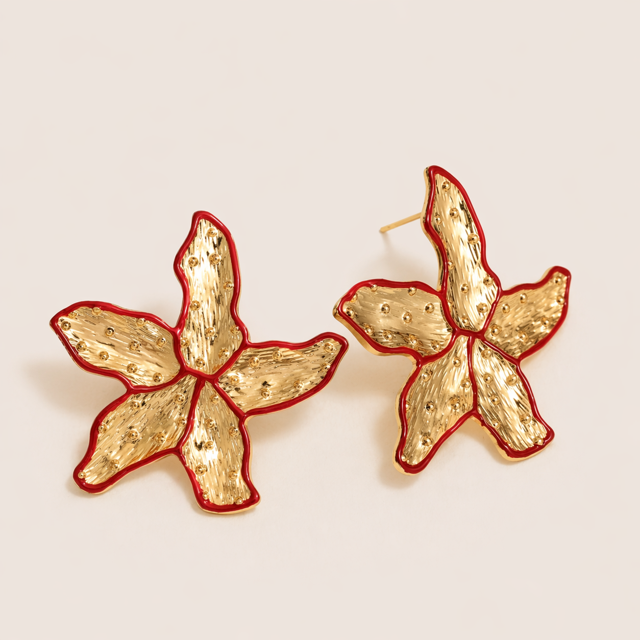 Make a bold statement with these striking stainless steel seastar earrings. Polished to perfection, each piece features the iconic five-pointed silhouette of a starfish with vibrant red accents that catch the light beautifully. Lightweight yet impactful, they're the perfect accessory for adding oceanic charm and contemporary edge to any look. Durable stainless steel construction ensures lasting wear and effortless maintenance.