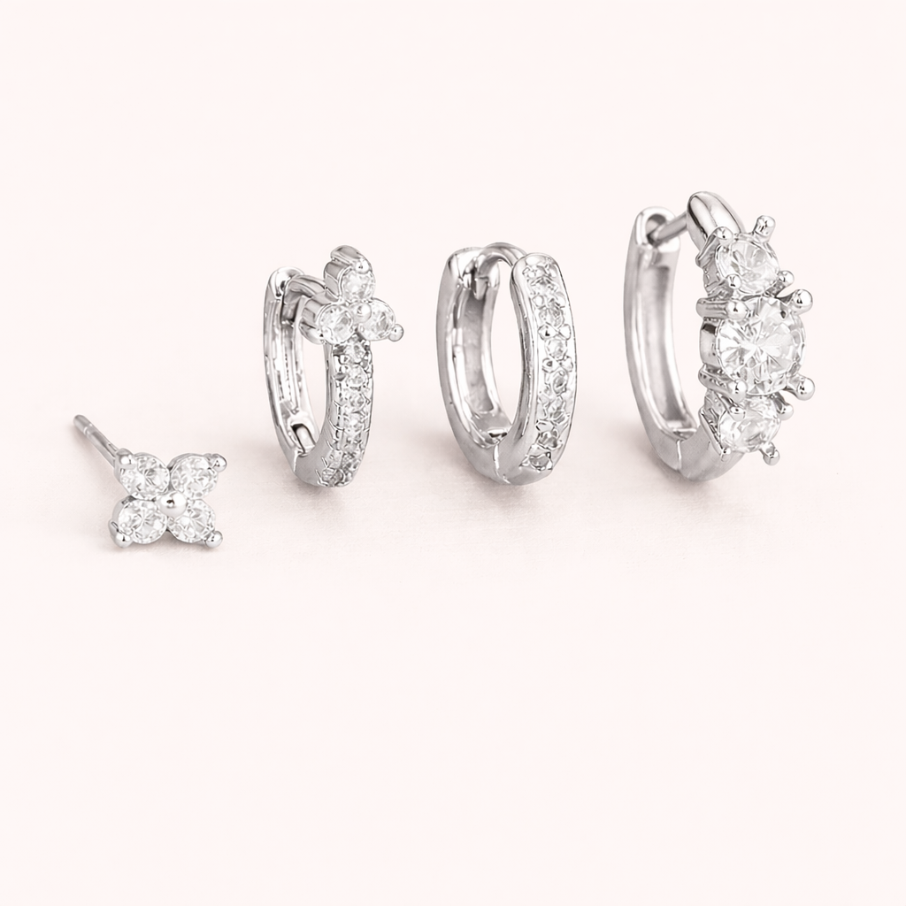 Sparkle and shine with the Elle SET! This fabulous four-piece collection features three stunning hoop earrings plus one dazzling stud, all crafted from durable stainless steel and adorned with brilliant white zirconia. Mix, match, and layer to your heart's content—whether you're going for subtle elegance or full-on sparkle. Hypoallergenic and built to last, these beauties are your ticket to effortless glamour every single day.