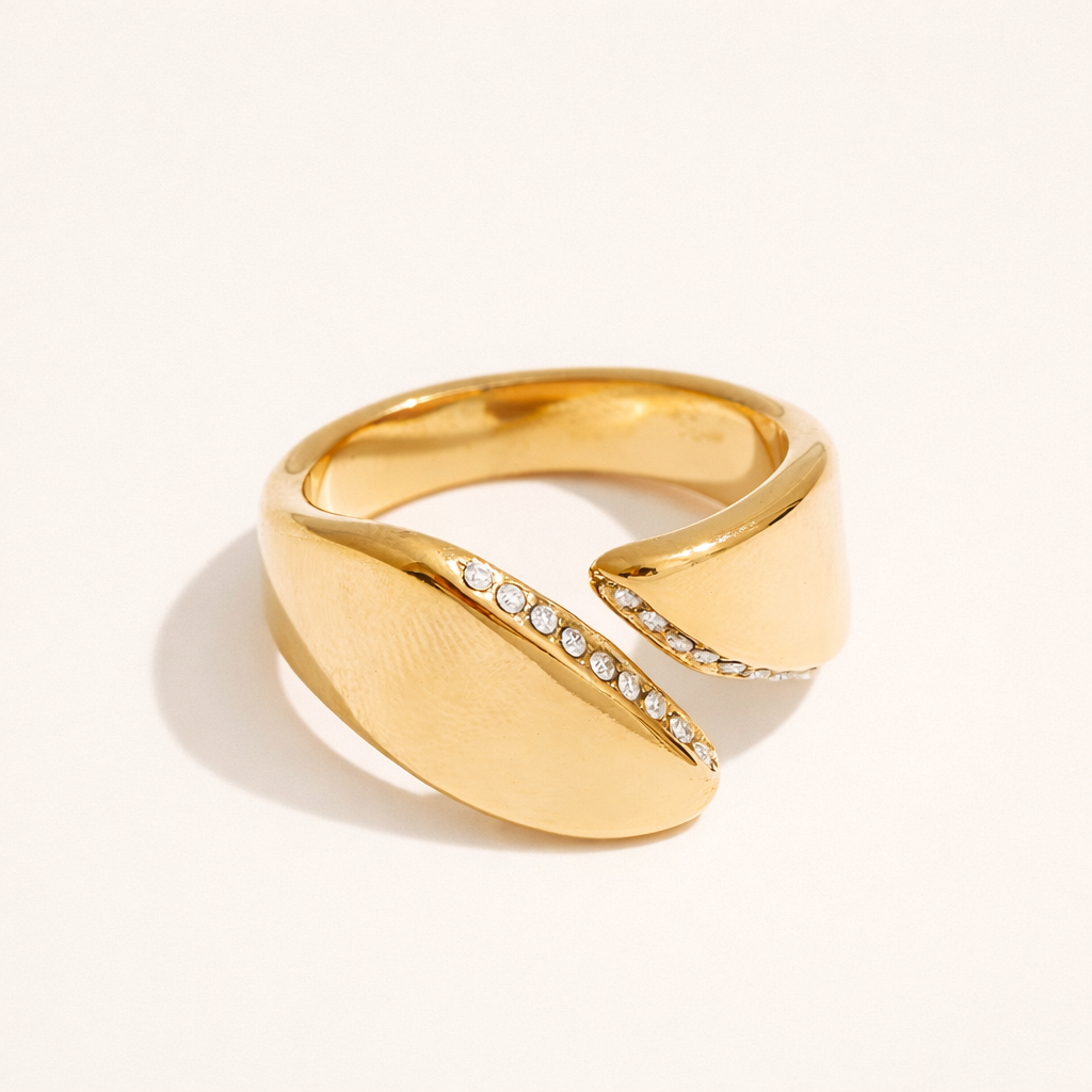 Maddie RING with a little sparkle — the perfect blend of elegance and durability. Crafted from premium stainless steel, this ring resists discoloration and maintains its lustrous finish through everyday wear. Available in multiple sizes to ensure a perfect fit for every hand. The subtle sparkle adds just the right touch of glamour to any look, whether dressed up or down.