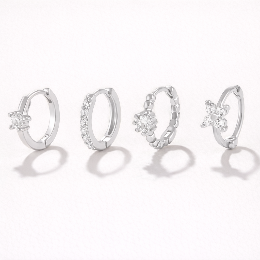 Elevate your ear game with the Desiree SET—a fabulous quartet of stainless steel hoops that mean serious sparkle. Each pair features dazzling white zirconia stones that catch the light like tiny diamonds, giving you that luxury look without the luxury price tag. Mix, match, and stack to your heart's content. Durable, hypoallergenic, and ready to become your go-to rotation. Four pairs, infinite styling possibilities!
