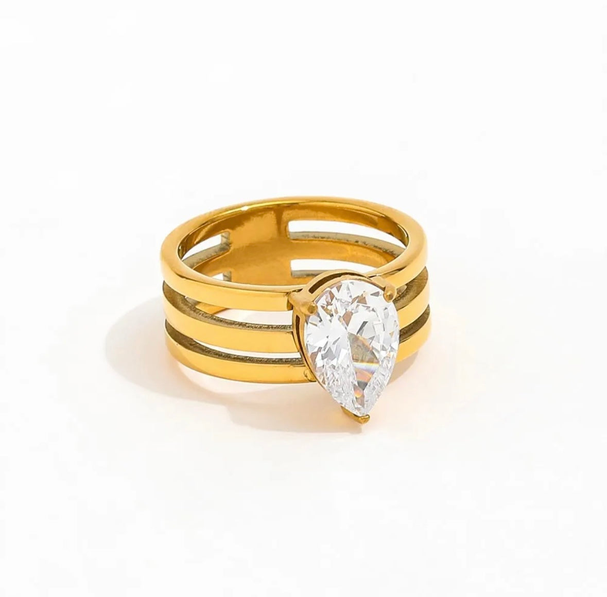 Introducing the Mona RING! This statement ring, made of durable stainless steel, boasts a stunning drop-shaped white zirconia. Elevate any outfit with this bold and eye-catching piece. Who needs diamonds when you have a Mona RING?!